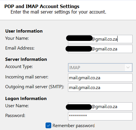 - Incoming mail server (IMAP): Server name mail.gmail.co.za, encryption type None, server port 143