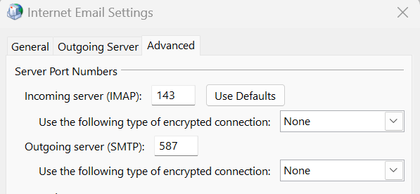 - Outgoing mail server (SMTP): Server name mail.gmail.co.za, encryption type None, server port 587
